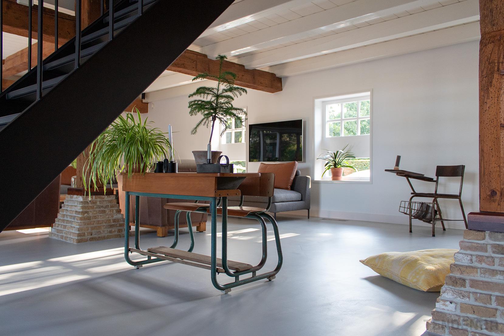Deze oude woonboerderij heeft nog veel authentieke details, zoals het karakteristieke balkenplafond, oude houten spanten constructie en het metselwerk. Vroeger lag hier een boerentegelvloer, maar met de nieuwe microcementvloer komen de authentieke bouwkundige details nog mooier uit.